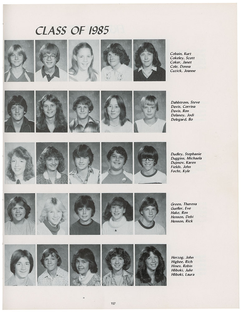 The 1981 edition of the Sylvan, Montesano High School’s (Washington) yearbook, issued during Cobain’s 8th grade year, 8.75 x 11.25, 200 pages. Hardcover yearbook features Cobain’s individual portrait on page 157, with another image of Kurt playing a snare drum at a school assembly on page 160. Several other key people in Cobain’s early life are featured in the book as well, including: Bull Osborne, a founding member of the Melvins and bassist in Cobain’s first band; classmates Trevor Briggs and John Fields; and his wrestling coach and mentor Kenichi Kanno. In fine condition, with some mild handling wear. The book is free from signatures. A well-preserved look into Cobain’s early years, which were both traumatic and formative. RR Auction COA.