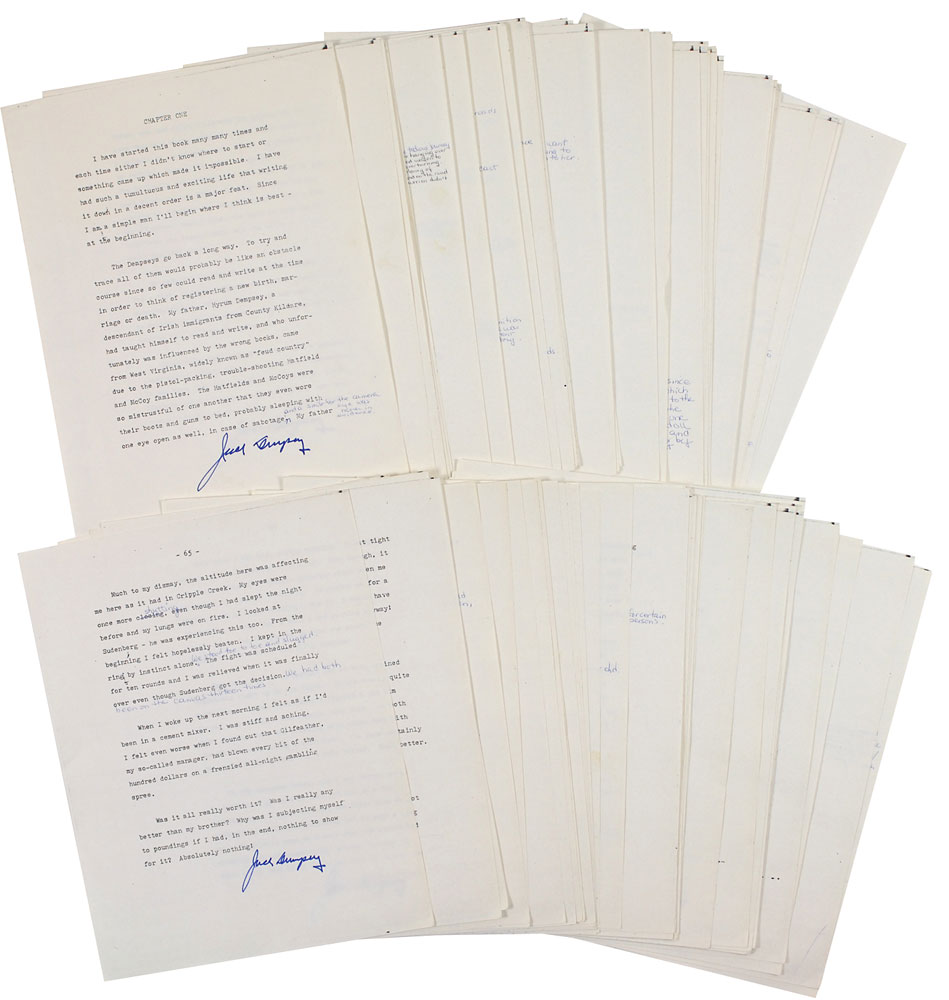 Completed in 1977 with the help of his step-daughter Barbara, Dempsey tells the story of the poor Colorado coal miner’s rise to fame in his own words. Along with a highly personal account of his life as a movie star (offering a low opinion of his own ability and unfortunate high-pitched voice), and his brushes with the law, he offers a unique view of the some of the most dramatic moments of his career: the day he won the championship fight against Willard, the day Firpo knocked him out of the ring, and the ‘long count’ bout against Tunney. This manuscript, noticeably different from the published version, offers a remarkable look into the champion fighter’s life, and with Dempsey signing nearly a hundred times, is an incredible rarity. Pre-certified Steve Grad/PSA/DNA and RR Auction COA.