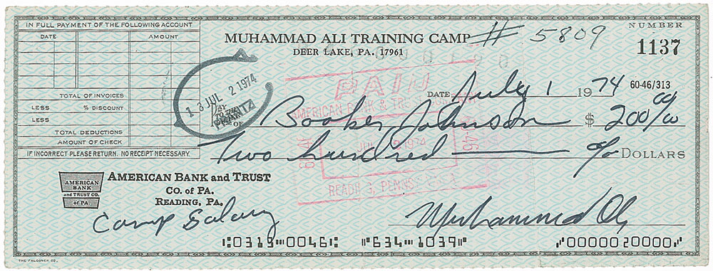 Muhammad Ali Training Camp check, 8 x 3, filled out and signed by Ali, payable to Booker Johnson for $200.00, July 1, 1974. In fine condition, with three vertical folds, one through a single letter of signature, and a bank stamp to body. Pre-certified Steve Grad/PSA/DNA and RR Auction COA.