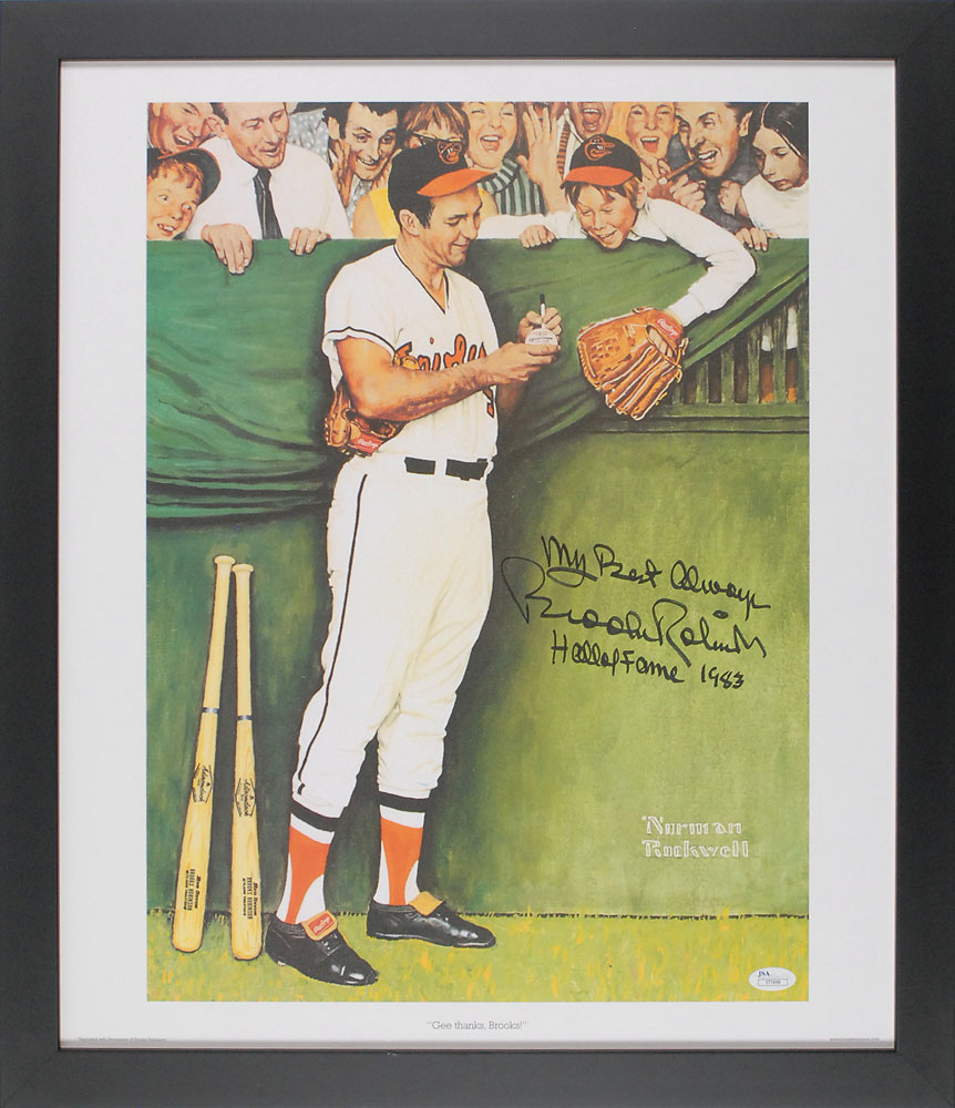 Color 17.5 x 21 print entitled ‘Gee thanks, Brooks!’ by Norman Rockwell, signed in black felt tip, “My best always, Brooks Robinson, Hall of Fame 1983.” Framed to an overall size of 20.25 x 23.5. In fine condition, with a James Spence authentication label affixed to lower corner. Accompanied by a certificate of authenticity from James Spence. Pre-certified Steve Grad/PSA/DNA and RR Auction COA.