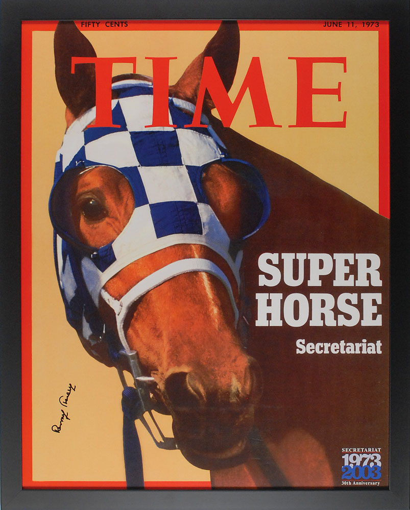 Sportswoman who bred and raced Secretariat. Color 21.5 x 27.5 poster of the front cover of the June 11, 1973, cover of Time magazine featuring Secretariat, signed in black felt tip by Chenery. Framed to an overall size of 24 x 30. In fine condition. Accompanied by a certificate of authenticity from PSA/DNA. RR Auction COA.