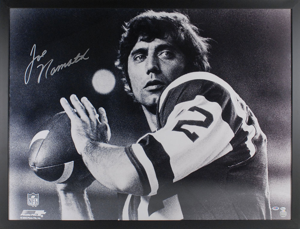 Glossy 39.5 x 29.5 photo of Namath throwing a warm-up pass, signed in silver ink. Framed to an overall size of 42 x 32. In fine condition, with a PSA/DNA authentication label affixed to lower corner. RR Auction COA.