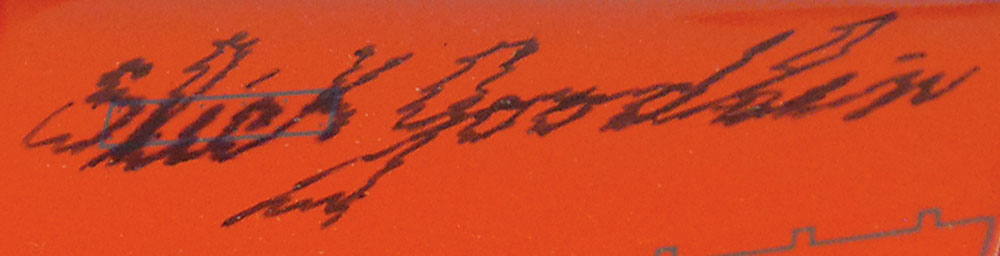 Well-done scale composite model of a Bell XS-1 jet, signed on the wing in black felt tip by Goodlin, post-stroke. Model is accompanied by its display stand. In fine condition. Accompanied by a photo taken at time of signing. RR Auction COA.