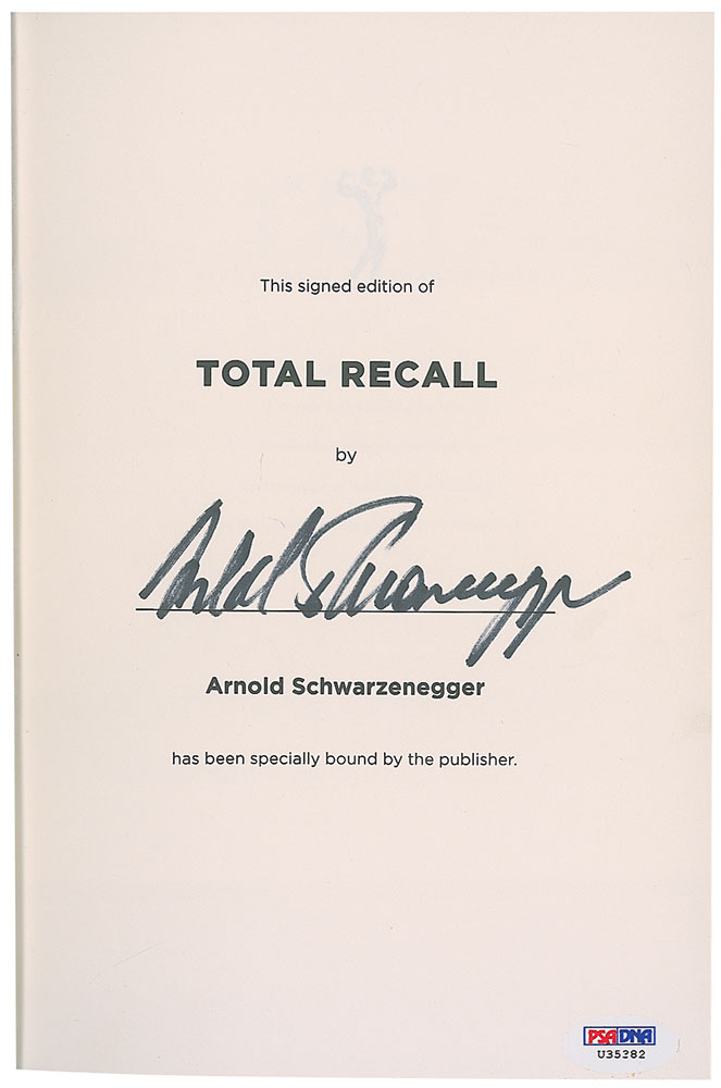 Signed book: Total Recall. First edition, first printing. NY: Simon & Schuster, 2012. Hardcover with dust jacket, 6.5 x 9.5, 646 pages. Signed in black ink on a special prefatory page. In fine condition with a PSA/DNA label affixed to the lower right corner of the title page. Accompanied by a certificate of authenticity from PSA/DNA. RR Auction COA.