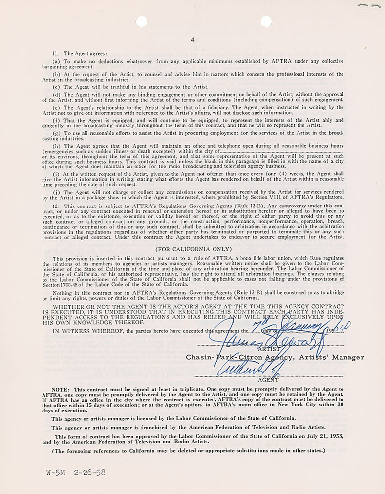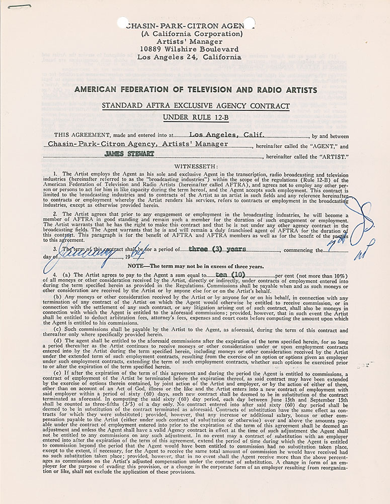 DS, two pages both sides, 8.5 x 11, January 7, 1964. Standard AFTRA Exclusive Agency Contract in which Stewart agrees to be represented by the Chasin-Park-Citron Agency for a period of three years. Signed at the conclusion in blue ballpoint by Stewart and countersigned by an agent. In fine condition. Pre-certified PSA/DNA and RR Auction COA.