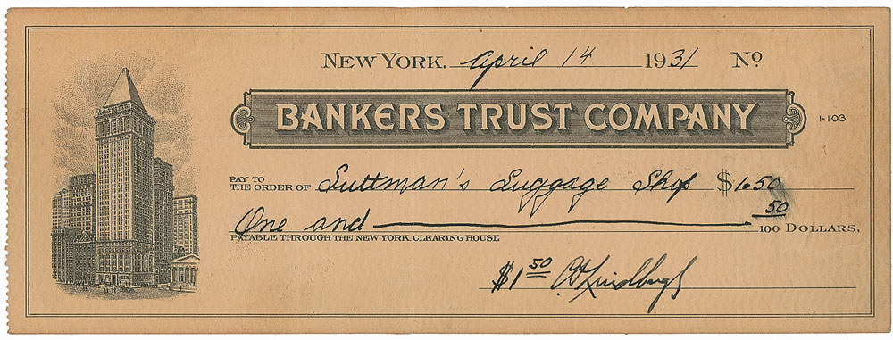 Rare Bankers Trust Company uncancelled check, 7.25 x 2.75, filled out in another hand and signed by Lindbergh, “$1.50 C. A. Lindbergh,” payable to Luttman’s Luggage Shop for $1.50, April 14, 1931. Several unobtrusive flattened vertical folds, a few creases, and overall toning, otherwise fine condition. It is interesting to note that Lindbergh’s payment is to a luggage store, since flight would go on to revolutionize travel in the ensuing years. While checks endorsed by Lindbergh occasionally enter the marketplace, ‘true’ checks signed on the front are few and far between—this is the first we have ever offered. Pre-certified PSA/DNA and RR Auction COA.