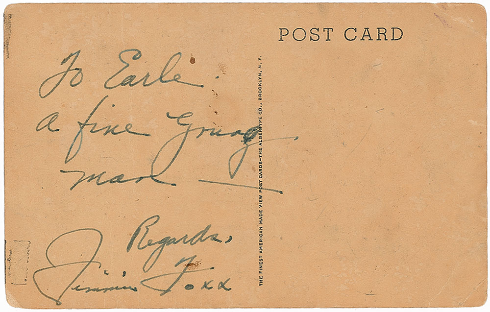 Uncommon Albertype Type II Hall of Fame plaque card, signed and inscribed on the reverse in black ink, “To Earle, a fine young man—Regards, Jimmie Foxx.” Overall toning, light dings and creases to corners, a few small areas of tape remnants to both sides, and an ink mark and two areas of surface loss to the front, otherwise very good condition. These Albertype cards were produced from 1945 through 1952 and sold at Hall of Fame in Cooperstown; signed examples are highly sought after due to their scarcity. Pre-certified Steve Grad/PSA/DNA and RR Auction COA.