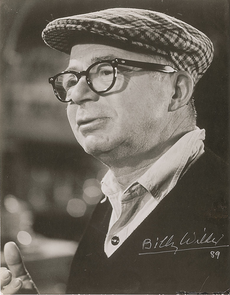 Glossy 7.5 x 9.5 head-and-shoulders photo of Wilder wearing a cap, signed in the lower right in silver ink, “Billy Wilder, 89.” In fine condition, with creasing to bottom edge. Pre-certified PSA/DNA and RR Auction COA.