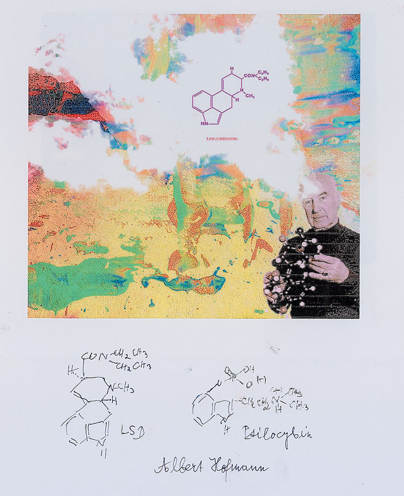 Swiss chemist (1906–2008) best known for the discovery of LSD. Original signed ink sketches of the chemical structures of LSD and Psilocybin on an off-white 8.25 x 10 sheet with an image of Hofmann printed in the upper portion. In fine condition. RR Auction COA.