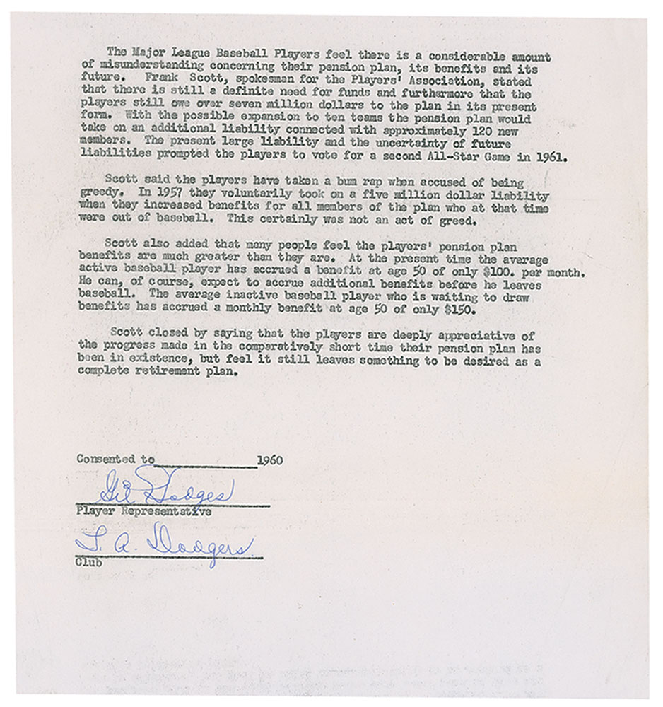 DS, signed “Gil Hodges, L. A. Dodgers,” one page, 8.25 x 8.75, 1960. Document regarding the pension plans of former players. In part: “The Major League Baseball Players feel there is a considerable amount of misunderstanding concerning their pension plan, its benefits and its future. With the possible expansion to ten teams the pension plan would take on an additional liability connected with approximately 120 new members. The present large liability and the uncertainty of future liabilities prompted the players to vote for a second All-Star Game in 1961.” In fine condition, with various creases. Accompanied by a full letter of authenticity from JSA. Pre-certified Steve Grad/PSA/DNA and RR Auction COA.