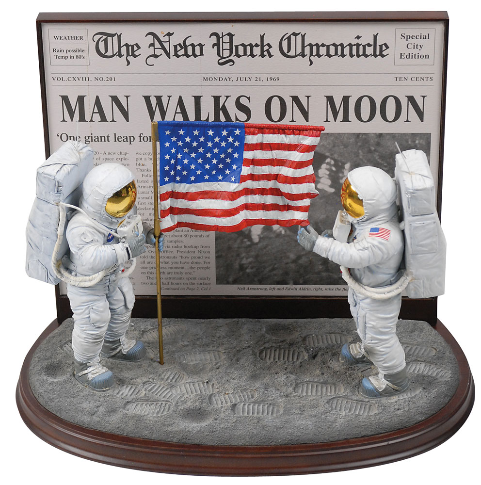 Meticulously detailed hand-painted model by the Danbury Mint entitled ‘One Small Step for Man,’ measuring approximately 14 x 11 x 7, featuring sculpted figures of Neil Armstrong and Buzz Aldrin on the lunar surface with the American flag, displayed against a newspaper background image with the headline, “Man Walks on Moon.” In fine condition, with a few minor dings. Model comes in its original packaging, with the upper portion of the inner styrofoam missing. RR Auction COA.