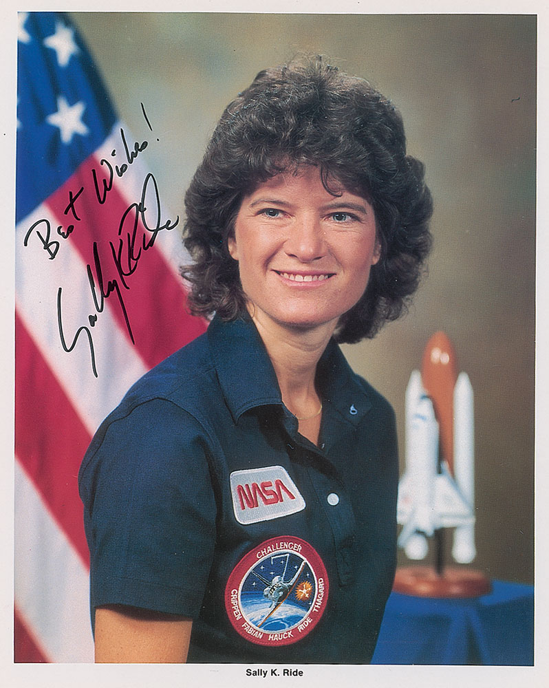 Color 8 x 10 NASA photo of Ride in front of flag and shuttle model, signed in black felt tip, “Best Wishes! Sally K. Ride.” In fine condition. Pre-certified Steve Zarelli and RR Auction COA.