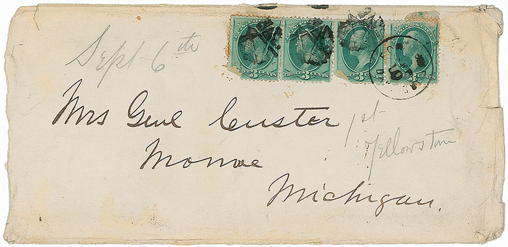 Mailing envelope, 8 x 4, addressed in Custer’s hand to “Mrs. Genl. Custer, Monroe, Michigan.” Envelope bears four three-cent George Washington postage stamps, and a Fort Buford, Dak., postmark. Envelope is also docketed by Mrs. Custer in pencil, “Sept 6th, 1st Yellowstone.” Scattered creases and soiling, several small edge tears, and a torn right edge, otherwise fine condition. Pre-certified PSA/DNA and RR Auction COA.