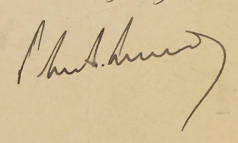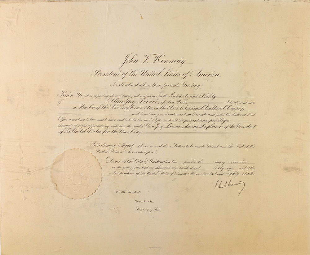 Partly-printed DS as president, one page, 22.75 x 19, November 14, 1961. President Kennedy appoints Alan Jay Lerner “a Member of the Advisory Committee on the Arts (National Cultural Center) and do authorize and empower him to execute and fulfill the duties of that Office and to have and to hold the said Office with all the powers and privileges thereunto of right appertaining unto him the said Alan Jay Lerner, during the pleasure of the President of the United States for the time being.” Signed at the conclusion by Kennedy and countersigned by Secretary of State Dean Rusk. Document is affixed to an identical size mount. Vertical creases, one through a single letter of signature, scattered toning and soiling, and some mild rippling from adhesive, otherwise very good condition. The white seal is toned and rippled, but intact. Kennedy’s signature is very bold. Aside from being a classmate of Lerner’s in prep school and college, Kennedy had a great affinity for the music from Camelot. It wasn’t until after his death that his administration would acquire its iconic nickname, taken from a Life magazine interview in which Jackie mentioned some lines from the musical. Pre-certified John Reznikoff/PSA/DNA and RR Auction COA.
