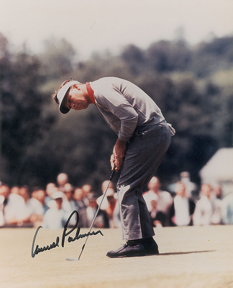 Color glossy 8 x 10 photo of Palmer on the putting green, signed in black felt tip. In fine condition. Pre-certified Steve Grad/PSA/DNA and RR Auction COA.
