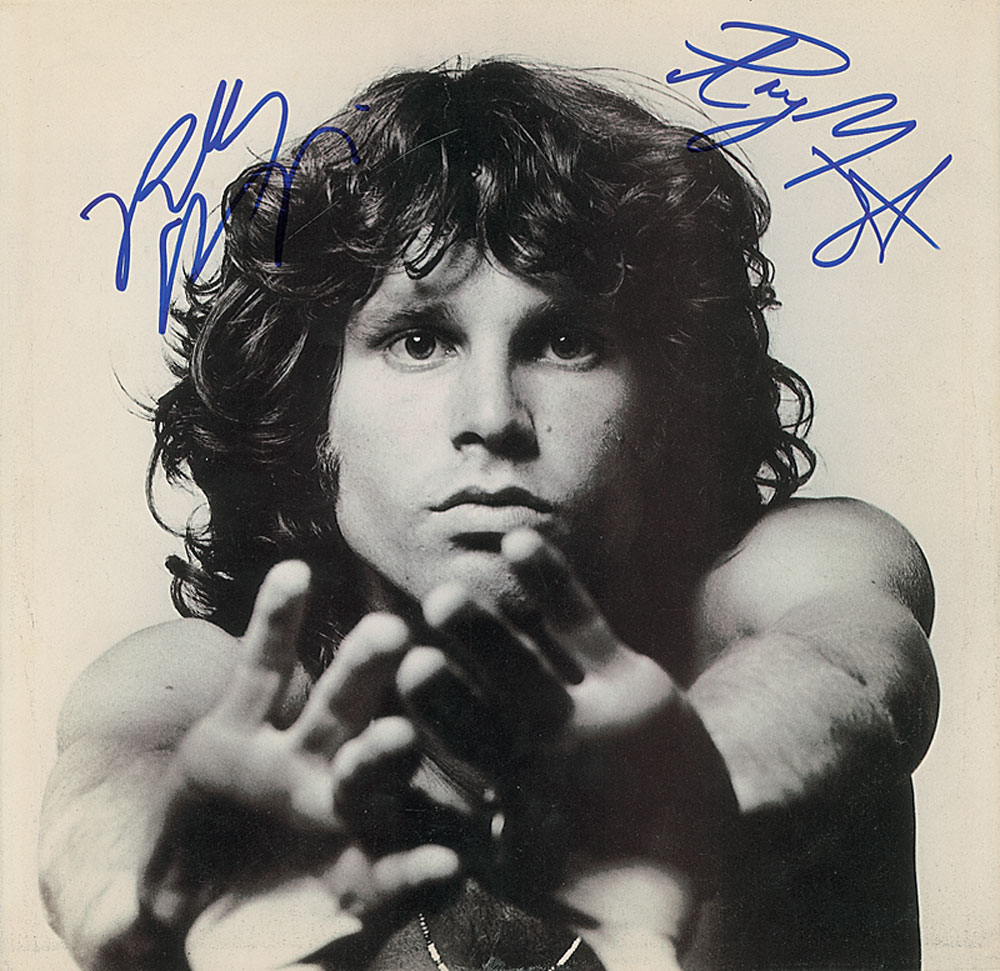 Inside album sleeve to The Doors Greatest Hits album signed in blue felt tip by Ray Manzarek and Robby Krieger. In fine condition. Pre-certified Roger Epperson/REAL and RR Auction COA.