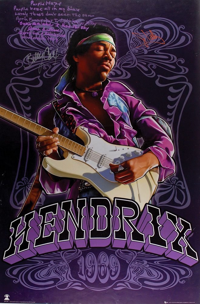 Color 24 x 36 poster celebrating Hendrix and his band, signed in various color inks by Billy Cox, Jerry Velez, and Juma Sultan, who adds the lyrics to the first verse of ‘Purple Haze.’ Scattered edge creases and dings, otherwise fine condition. Rolled. RR Auction COA.