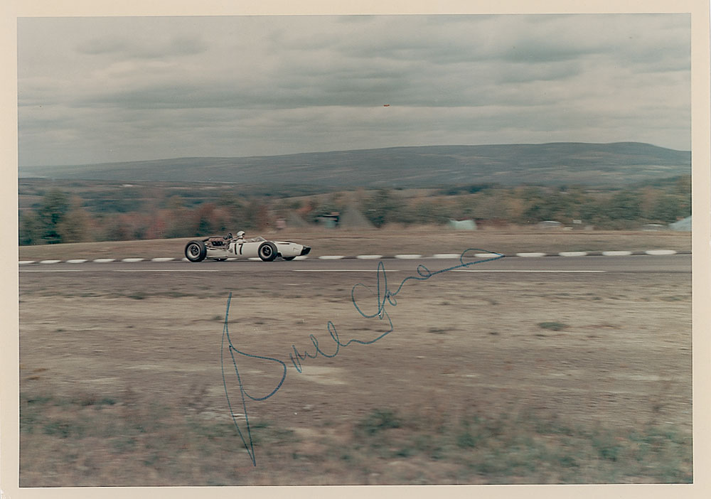 Formula One race car driver (1937-1970) who perished at Goodwood Circuit in England. Vintage color 7 x 5 candid photo of McLaren in his race car, signed in blue ballpoint. Photo is labeled on the reverse in pencil in an unknown hand, “1965 USGP.” In fine condition. Accompanied by a letter of authenticity from James Spence. Pre-certified Steve Grad/PSA/DNA and RR Auction COA.