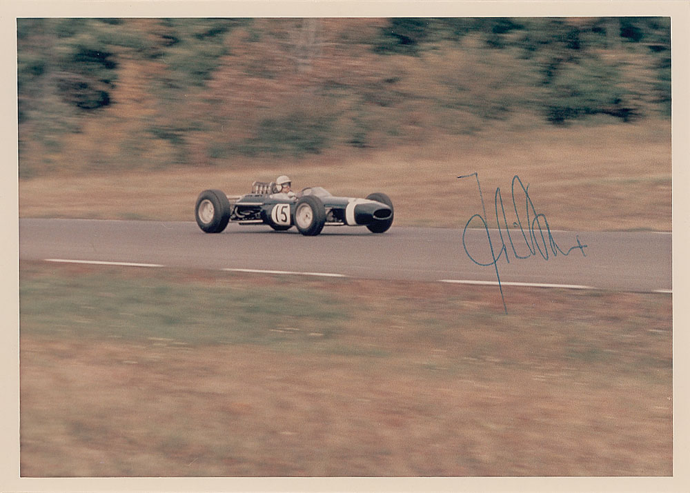 Swedish sportscar racing and Formula One driver who was killed in a race at Le Mans in 1972. Vintage color 7 x 5 candid photo of Bonnier tearing down a straightaway in his race car, signed in blue ballpoint. Photo is labeled on the reverse in pencil in an unknown hand, “1965 USGP.” In fine condition. Accompanied by a letter of authenticity from James Spence. Pre-certified Steve Grad/PSA/DNA and RR Auction COA.
