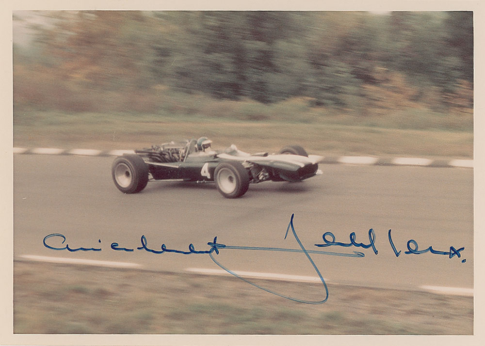 Fomer Formula One driver who won six Le Mans races. Vintage color 7 x 5 candid photo of Ickx flying by in his race car, signed in blue felt tip. Photo is labeled on the reverse in pencil in an unknown hand, “GPUS 1967.” In fine condition. Pre-certified Steve Grad/PSA/DNA and RR Auction COA.