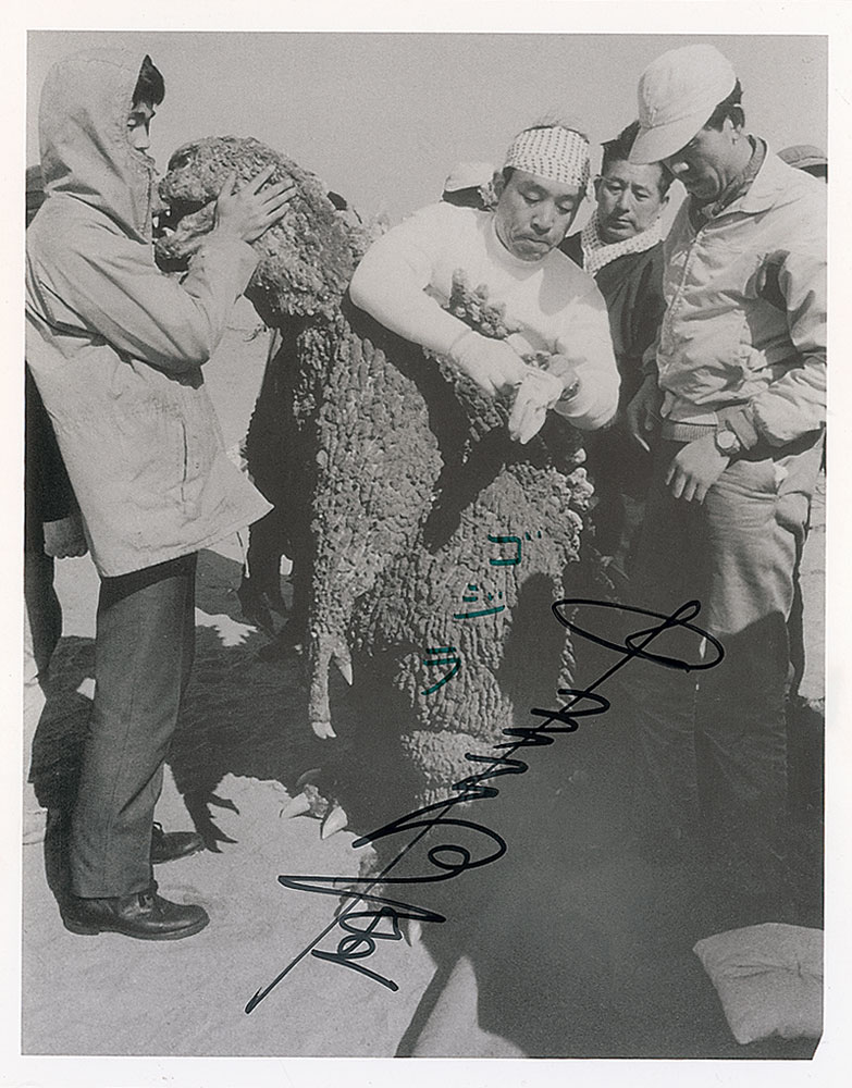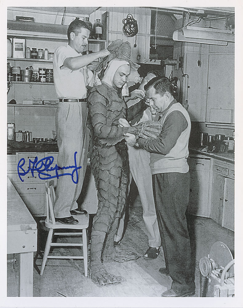 Two cardstock 8 x 10 photos: one showing Haruo Nakajima with Godzilla, signed in green and black felt tip; and one of Ben Chapman getting into costume as the Gill-man in Creature from the Black Lagoon, signed in blue felt tip. In overall fine condition. RR Auction COA.