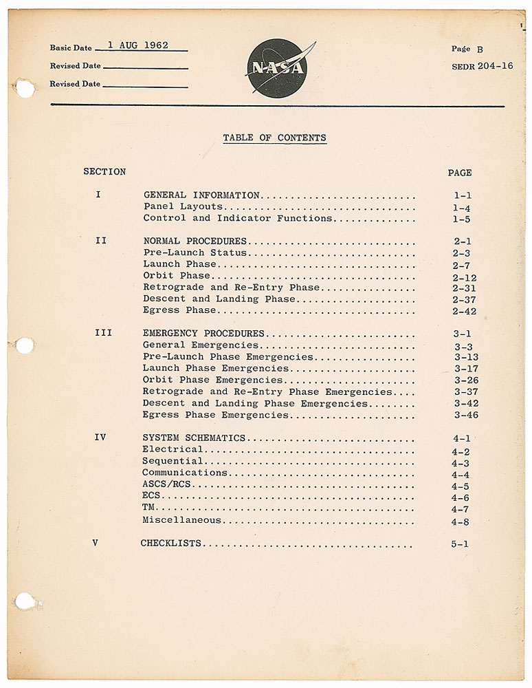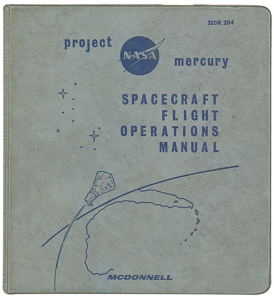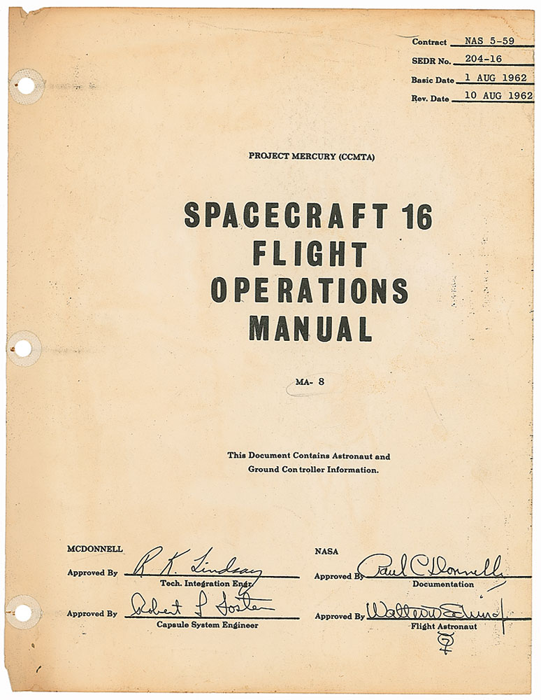 Extremely rare original operations manual titled “Project Mercury Spacecraft 16 Flight Operations Manual,” contract NAS 5-59, basic date August 1, 1962, and revision date August 10, 1962. Manual is in its original three-ring binder, measures 10.25 x 11.5, and contains over 100 pages. The title page states, “This document contains astronaut and ground controller information,” and bears printed signatures of four officials, including Sigma 7 astronaut Wally Schirra. Manual is full of flow charts, check lists, and procedures towards the lift-off of the vehicle. In very good condition, with scattered soiling (heavier on the first page) and toning, and expected light handling wear. RR Auction COA.