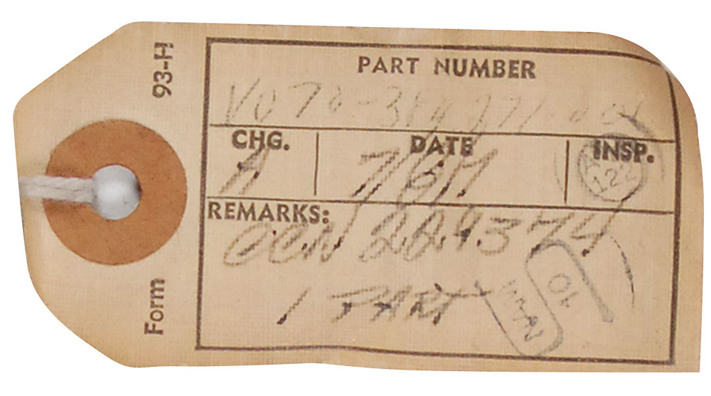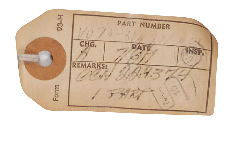 L-shaped space shuttle diffuser hose, measuring approximately 33″ long, covered in Beta cloth with a stencilled parts number near the flexible collar. Two parts tags are tied to the collar, with the parts number on both, as well as an inspector’s stamp and remarks. In fine condition. RR Auction COA.