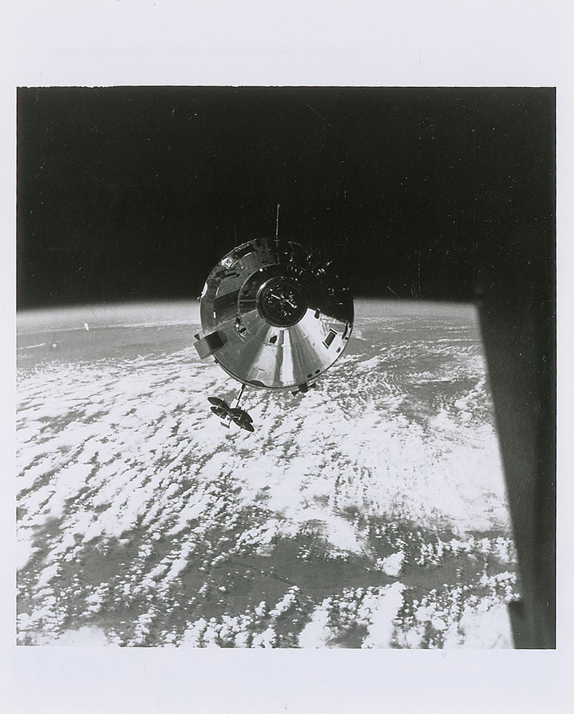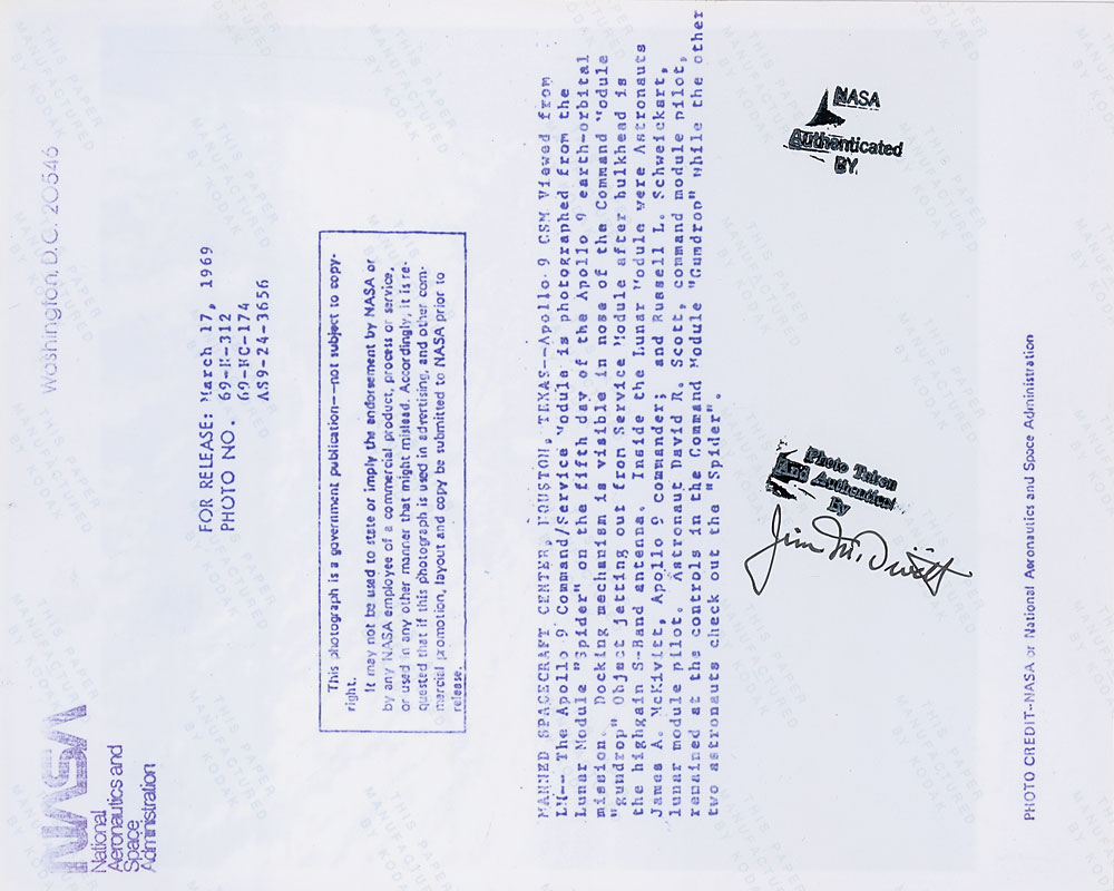 Glossy 8 x 10 NASA photo of the Apollo 9 command module taken in orbit from the lunar module. Reverse of photo bears a stamp which reads, “NASA photo taken and authenticated by,” and is signed in black felt tip by McDivitt. In very fine condition. Provenance: Superior Auction, Fall 1999. Pre-certified Zarelli Space Authentication.