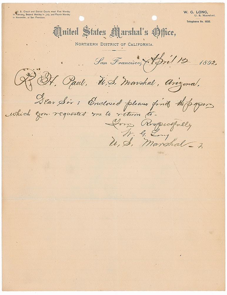 Western lawman who, as Sheriff of Pima County, was sent to Colorado with orders to return with the Earp brothers. LS, one page, lightly-lined, 8.5 x 10.75, United States Marshall Office letterhead, April 12, 1892. Brief letter to Marshal R. H. Paul in Arizona. In full: “Enclosed please find the papers which you requested me to return to.” Intersecting folds, punch holes to top, and some stray ink flecks, otherwise fine condition. RR Auction COA.