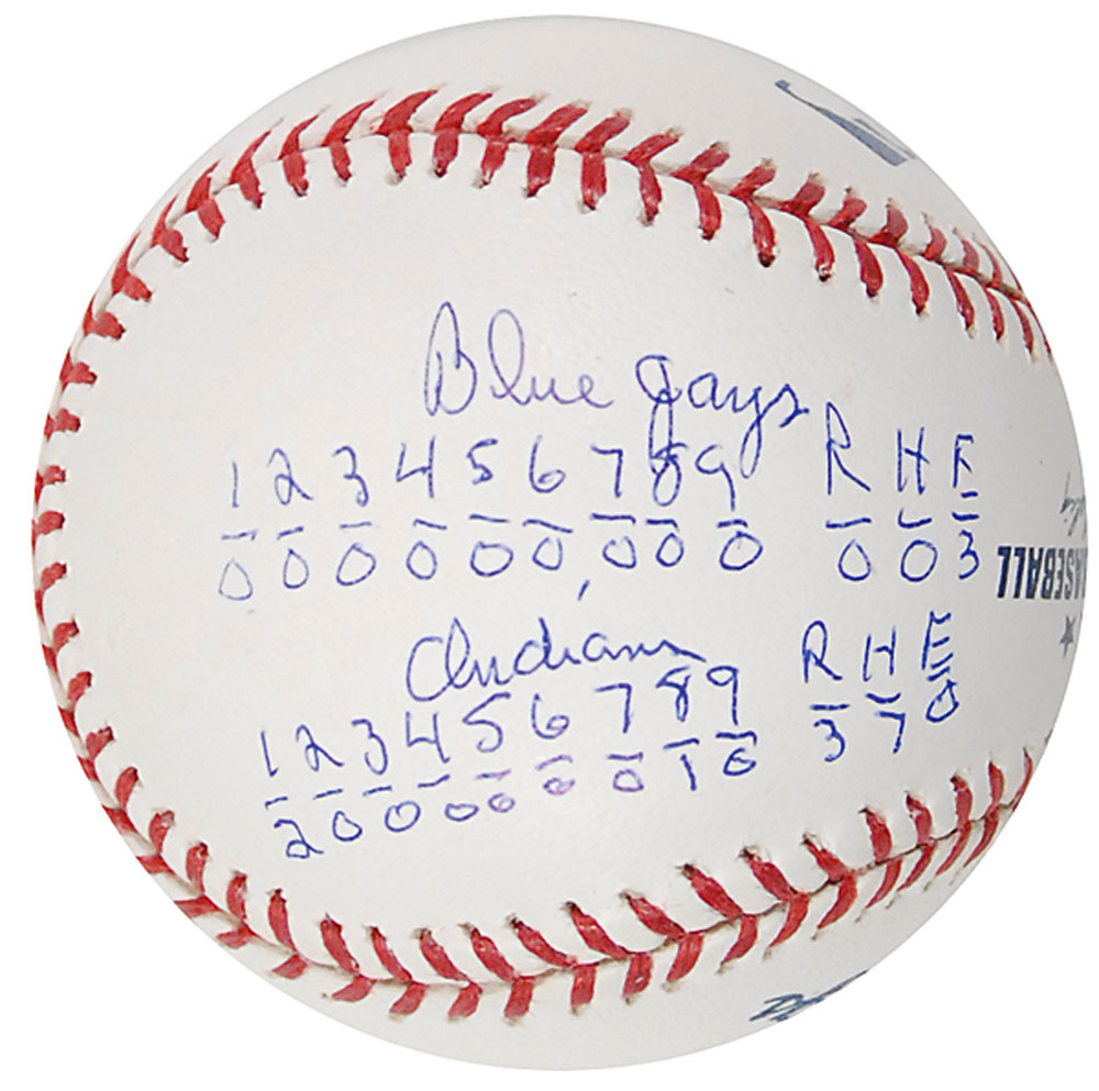 Official Rawlings Major League baseball signed in blue ballpoint on the sweet spot, “Len Barker, perfect Game vs Blue Jays, May 15, 1981,” adding the line score to a side panel. In fine condition. Pre-certified Steve Grad/PSA/DNA and RR Auction COA.