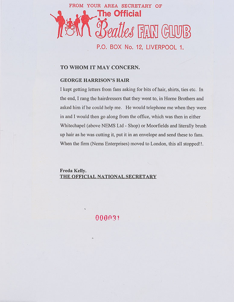 A generous collection of Harrison’s hair, measuring up to 1.5″ long, part of a larger group which was originally presented by Harrison to Beatles Fan Club secretary Freda Kelly as part of a promotion for their fan club. Hair is sealed in a Mylar sleeve and affixed to a numbered certificate of authenticity. Also accompanied by a color copy of the front of the original on which Harrison wrote, “real George Harrison hair (13/got a bunch),” and a printed statement from Kelly on how the hair was acquired. In very fine condition. As they burst on the scene, one of the band’s most identifiable and lasting looks were there ‘moptop’-style haircuts, which would become a world-wide style in the mid 1960s. When George was asked what he calls his hairstyle by a reporter at New York’s Plaza, he dryly replied ‘Arthur.’ That question would be used again in their upcoming film A Hard Day’s Night. RR Auction COA.
