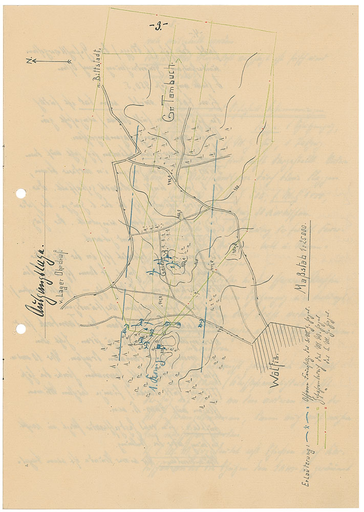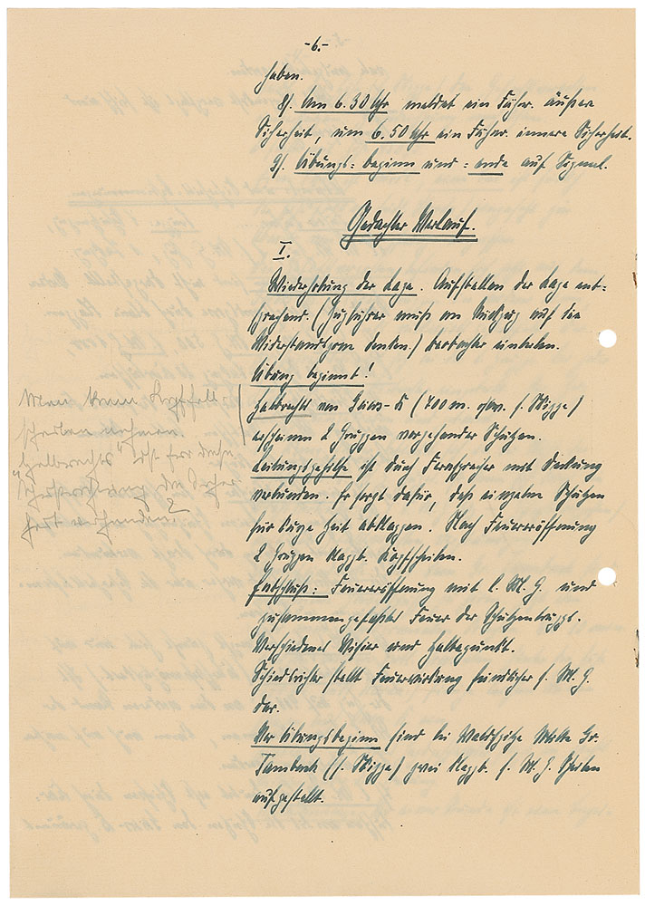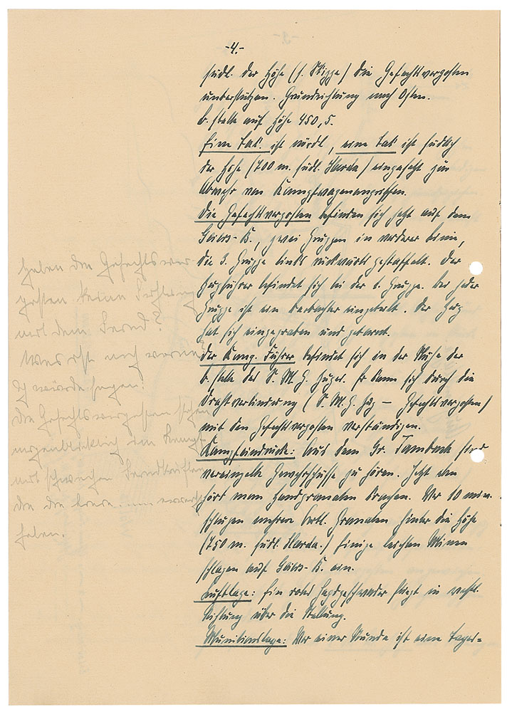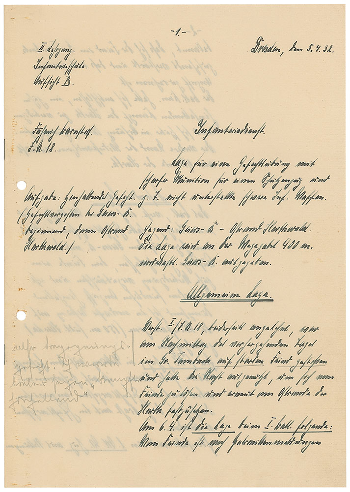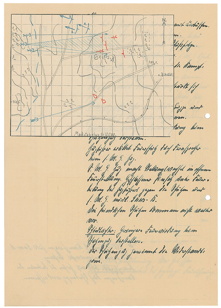 Training text report in German by a student named “Barnstorf,” who at the time of the report was a flagbearer, twelve pages on six adjoining sheets, Dresden, April 5, 1932. Barnstorf’s initial report, entitled, “Infantry Service,” includes several color hand-drawn maps and reads (translated): “Practice skirmish with real ammunition and heavy artillery for an Infantry outpost. Location: Geiersberg, East of Harthwald. 400m from the fork of the two roads. Situation: In the afternoon of the previous day, the forward post in Great Tambuch ran into heavy fighting with the enemy. Used the night to retreat from the enemy and set up renewed positions at the eastern edge of Harth. On 4/6 the 1st battalion reported that the enemy numbers are increasing and an assault is expected. The 1st battalion had decided to defend their position and then later when retreating to return to the Eastern edge of Harth.”