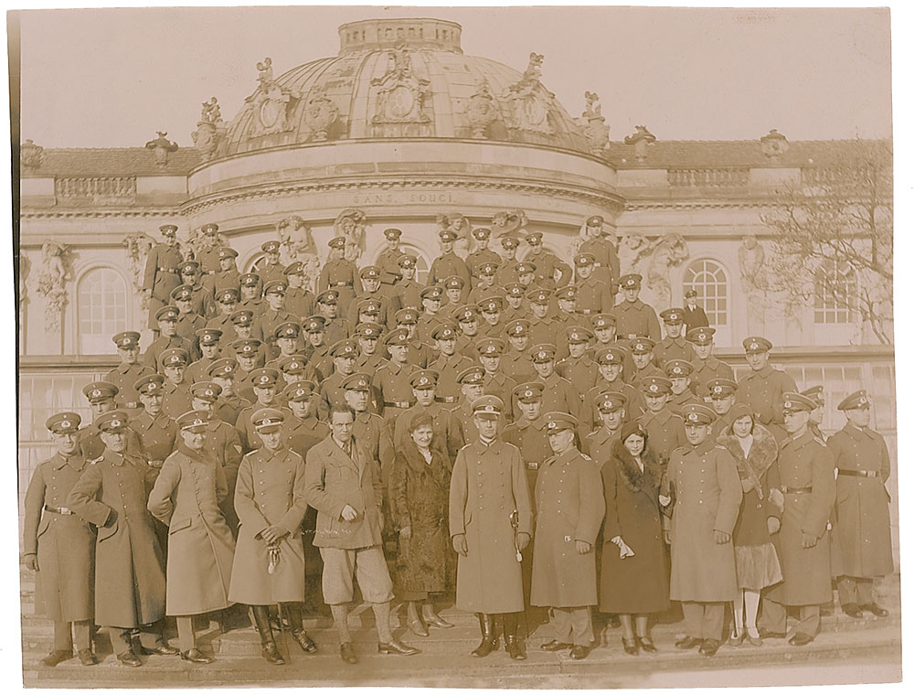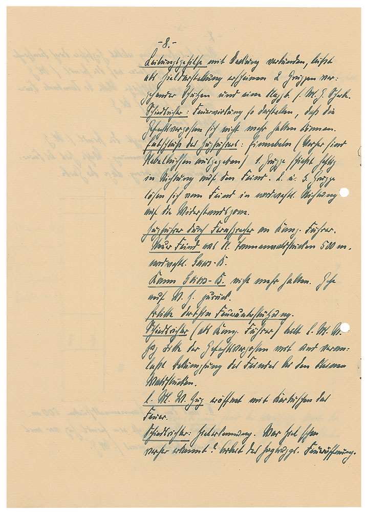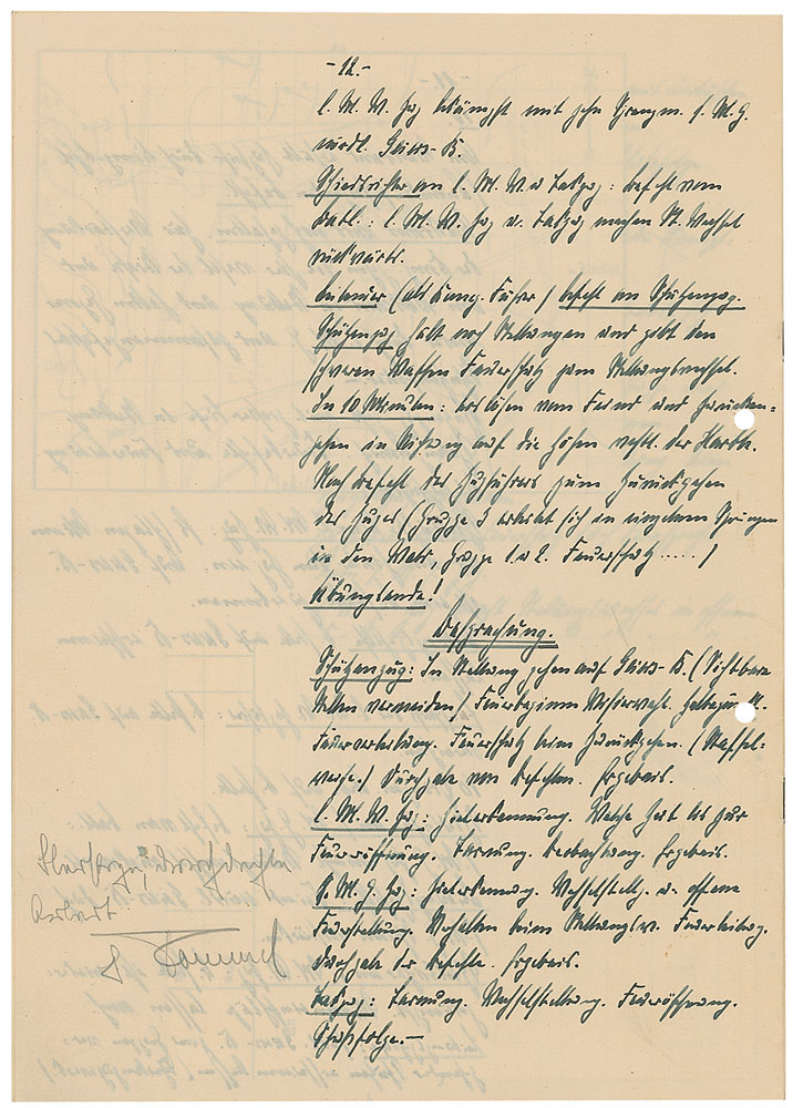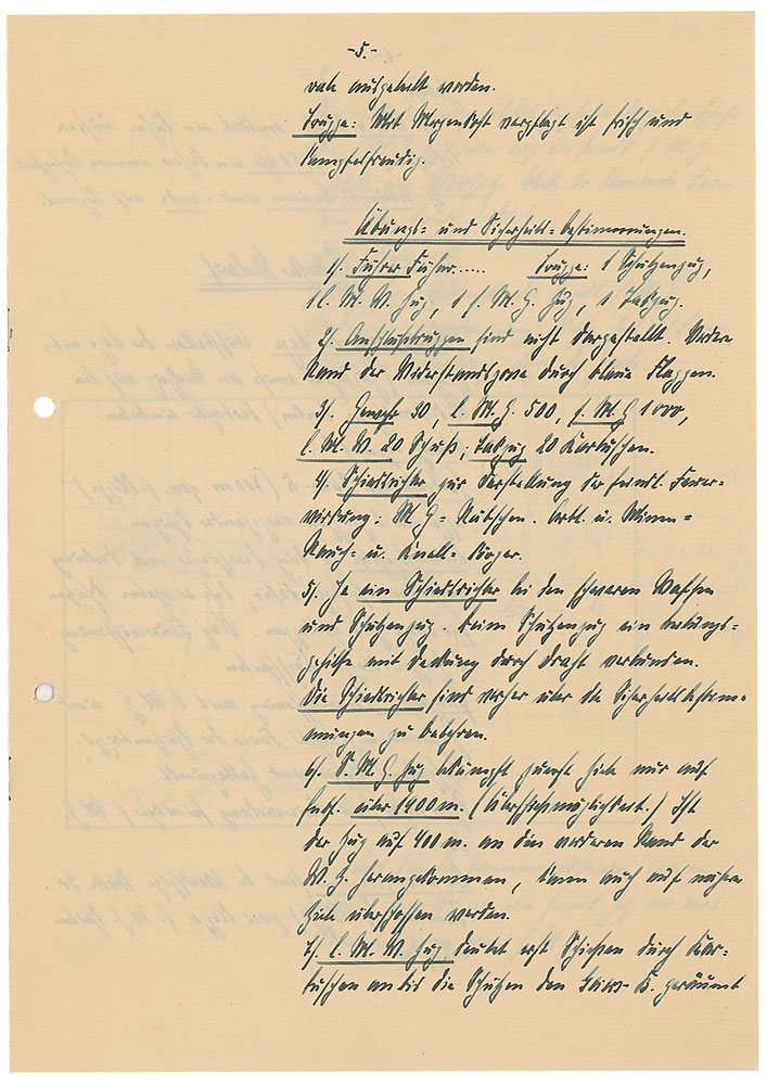 Training text report in German by a student named “Barnstorf,” who at the time of the report was a flagbearer, twelve pages on six adjoining sheets, Dresden, April 5, 1932. Barnstorf’s initial report, entitled, “Infantry Service,” includes several color hand-drawn maps and reads (translated): “Practice skirmish with real ammunition and heavy artillery for an Infantry outpost. Location: Geiersberg, East of Harthwald. 400m from the fork of the two roads. Situation: In the afternoon of the previous day, the forward post in Great Tambuch ran into heavy fighting with the enemy. Used the night to retreat from the enemy and set up renewed positions at the eastern edge of Harth. On 4/6 the 1st battalion reported that the enemy numbers are increasing and an assault is expected. The 1st battalion had decided to defend their position and then later when retreating to return to the Eastern edge of Harth.”