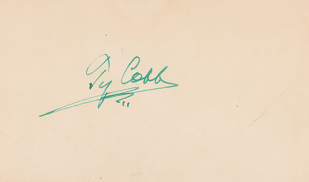 Vintage green fountain pen signature, “Ty Cobb,” on an off-white 5 x 3 card. In fine condition. Pre-certified Steve Grad/PSA/DNA and RR Auction COA.
