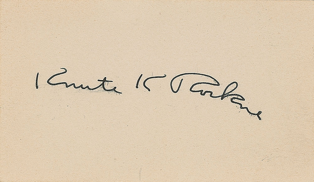 Bold vintage fountain pen signature, “Knute K. Rockne,” on an off-white 3.5 x 2 card. In fine condition. Pre-certified Steve Grad/PSA/DNA and RR Auction COA.