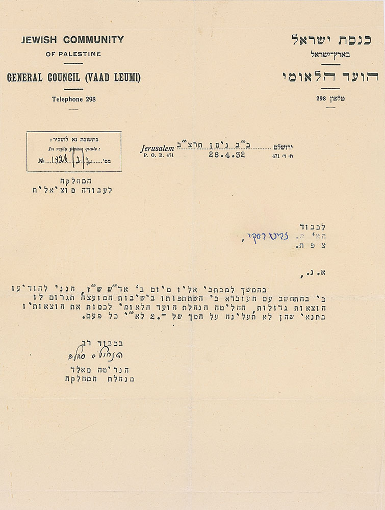 TLS in Hebrew, one page, 7.75 x 9.5, Jewish Community of Palestine letterhead, April 28, 1932. Letter to Ze'ev Jabotinsky. In part (translated): “I am writing to inform you that we have taken into consideration the fact that your participation in the Council’s meeting will incur great expenses. Therefore the management of the General Counsel decided to cover your expenses, providing that they will not exceed the total amount of 2 Lira Eretz Yisrael each time.” In fine condition, with intersecting folds. Jabotinsky was a prominent and influential activist, writer, and soldier who established a number of Jewish organizations. RR Auction COA.