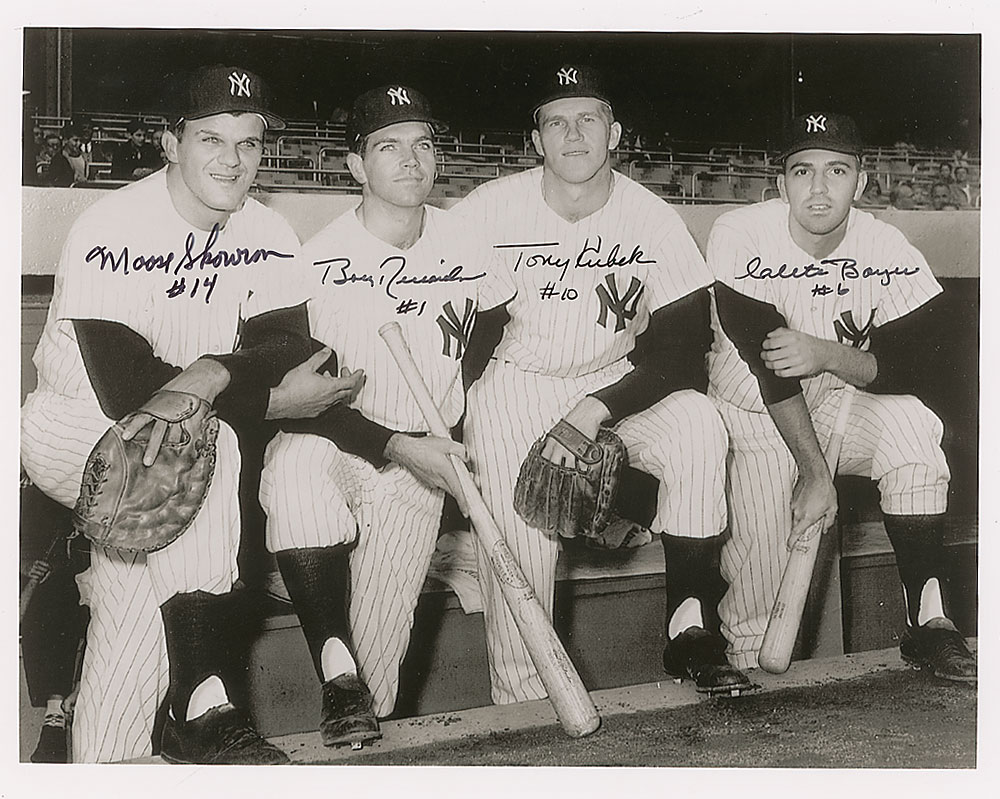 Glossy 10 x 8 photo of Bill ‘Moose’ Skowron, Bobby Richardson, Tony Kubek, and Clete Boyer standing on the dugout steps, signed in black ink by all four, each adding his number. In fine condition. Originates from Boyer’s personal collection, and is accompanied by a certificate of authenticity signed by him and dated August 6, 1998. Pre-certified Steve Grad/PSA/DNA and RR Auction COA.