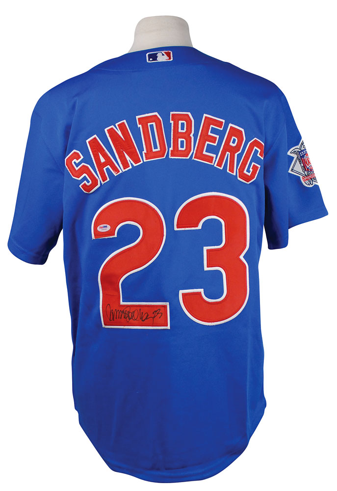 Official Majestic replica Chicago Cubs baseball jersey, with sewn on letters and numbers, signed in silver ink on the number on the back, “Ryne Sandberg 23.” In fine condition, with a PSA/DNA label affixed to the number. Accompanied by a certificate of authenticity from PSA/DNA. RR Auction COA.