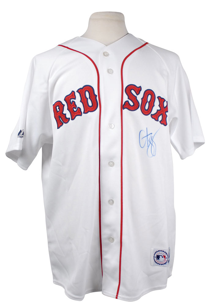 Official Majestic replica Boston Red Sox baseball jersey, with sewn on letters and numbers, signed in blue felt tip on the front. In fine condition, with a Steiner Sports label affixed to the tag. Accompanied by a certificate of authenticity from Steiner Sports. Pre-certified Steve Grad/PSA/DNA and RR Auction COA.