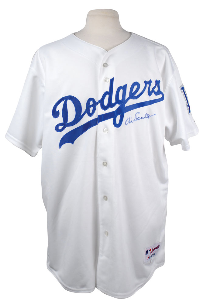 Uncommon official Majestic replica Los Angeles Dodgers baseball jersey, with sewn on letters and numbers, signed in blue felt tip on the front. In fine condition. Pre-certified Steve Grad/PSA/DNA and RR Auction COA.