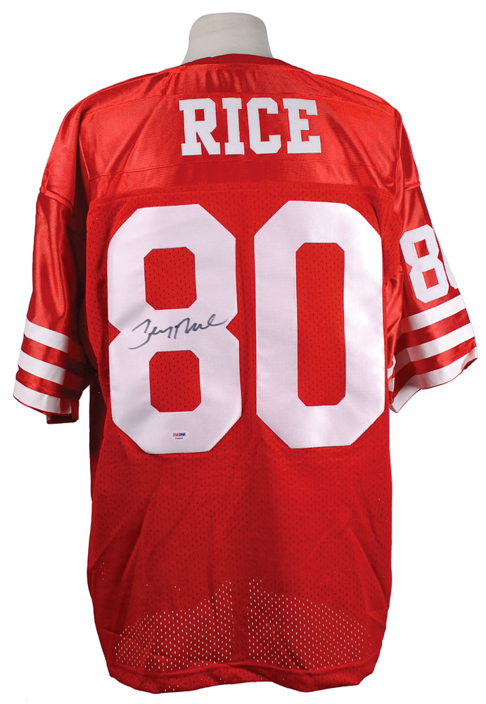 Replica San Francisco 49ers football jersey, with sewn on letters and numbers, signed in black felt tip on the number on the back. In fine condition, with a PSA/DNA label affixed to the number. Accompanied by a certificate of authenticity from PSA/DNA. RR Auction COA.