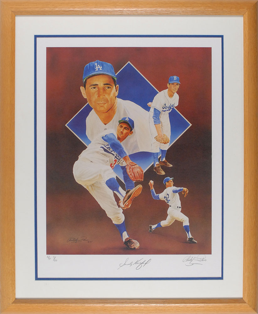 Color limited edition 17.5 x 23 composite print of Koufax in various pitching poses, numbered AP 7/50, signed in the lower border in pencil. Also signed in pencil by the artist, Christopher Paluso. Double-matted in Dodgers colors and framed to an overall size of 25 x 31. In fine condition. Pre-certified Steve Grad/PSA/DNA and RR Auction COA.