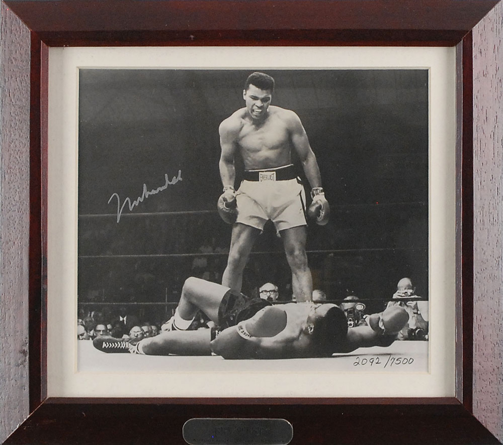 Limited edition commemorative watch set by Fossil in a wooden presentation box with lid featuring a 6.5 x 5.5 cardstock photo of Ali standing over the defeated Sonny Liston, numbered 2092/7500, signed in silver ink by Ali. The watch, metal case, and original box are included. In overall fine condition. Pre-certified Steve Grad/PSA/DNA and RR Auction COA.