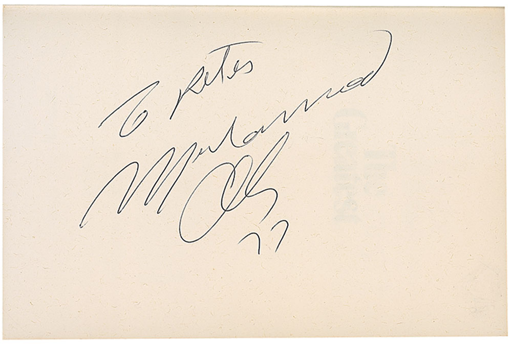 Signed book: The Greatest. First edition, later printing. NY: Random House, 1975. Hardcover with dust jacket, 6.5 x 9.5, 415 pages. Signed and inscribed on the first free end page in black ballpoint, “To Peter, Muhammad Ali, ’77.” In fine condition, with foxing and a publisher’s stamp to text block edges. Pre-certified Steve Grad/PSA/DNA and RR Auction COA.