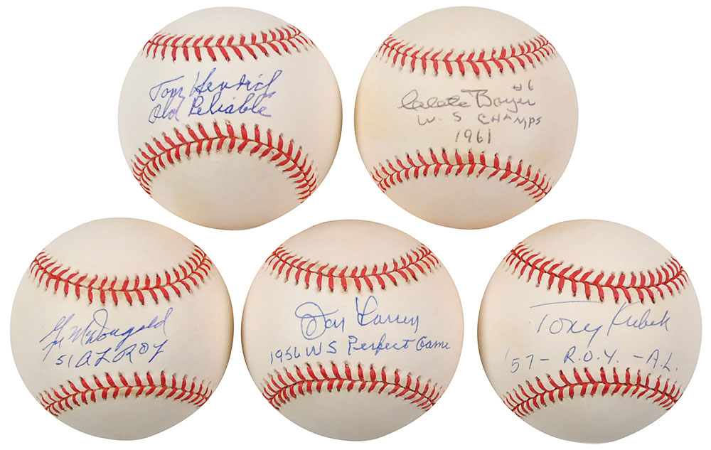 Five official Rawlings American League baseballs, each signed on the sweet spot in ballpoint by a former Yankee, most adding additional notations below. Signers are: Don Larsen, Clete Boyer, Tom Henrich, Gil McDougald, and Tony Kubek. In overall fine condition. RR Auction COA.