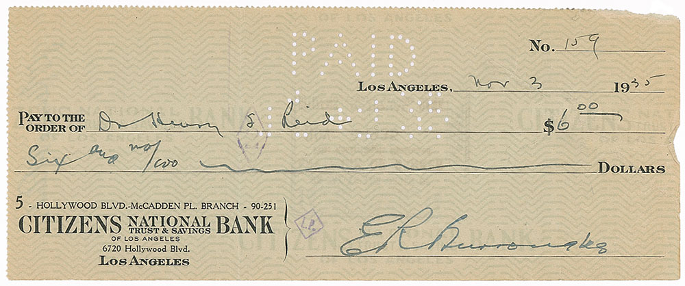 Bank check, 7.75 x 3, filled out in another hand and signed by Burroughs, “E. R. Burroughs,” payable to Dr. Henry S. for $6.00, November 3, 1935. In very good condition, with a vertical fold, expected cancellation holes and stamps, and scattered creasing. RR Auction COA.