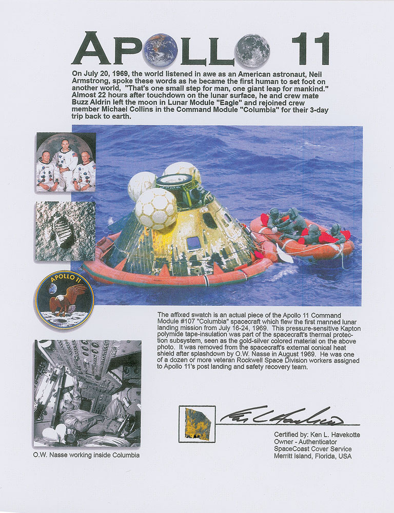 A .5 x .5 swatch of Kapton foil removed from the Apollo 11 Command Module Columbia’s thermal protection subsystem, removed after splashdown by O. W. Nasse, who was assigned to the Apollo 11 post landing and safety recovery team. Piece is affixed to an 8.5 x 11 informational letter of authenticity from Ken Havekotte. Presented within an Apollo 11 folder containing further details about the mission. RR Auction COA.