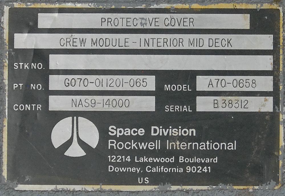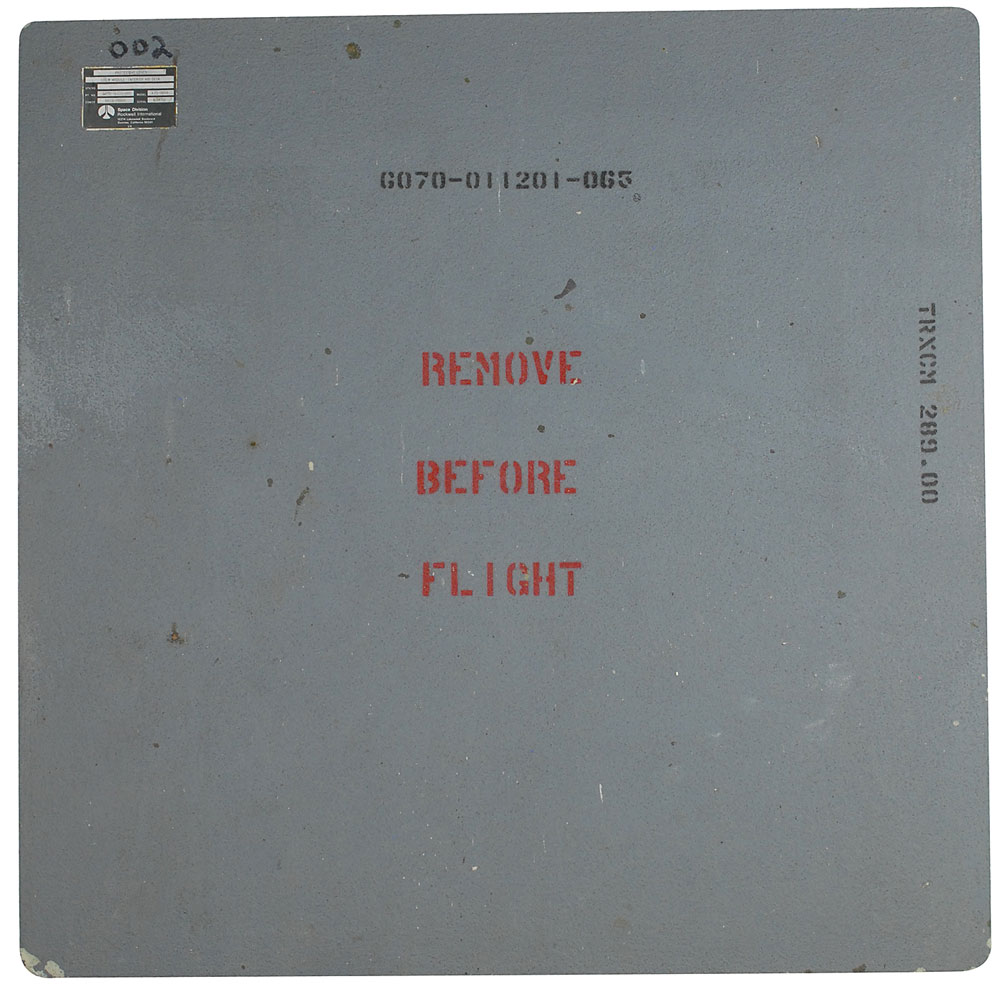Protective Cover Crew Module-Interior Mid Deck, 29.5 x 29.5, used to protect the interior of the Shuttle from UV damage while on the ground. Panel bears printed numbers and letter "TRXCM 289.00," and "G070-011201-065," and handwritten, "002." Affixed Rockwell International Space Division plaque reads: "Protective Cover Crew Module-Interior Mid Deck, Pt. No. G070-011201-065, Model A70-0658, Contr. NAS9-14000, Serial B38312." Stencilled in the center in bright red letters is: "REMOVE BEFORE FLIGHT." In fine condition. Provenance: Charles Bell collection. RR Auction COA.