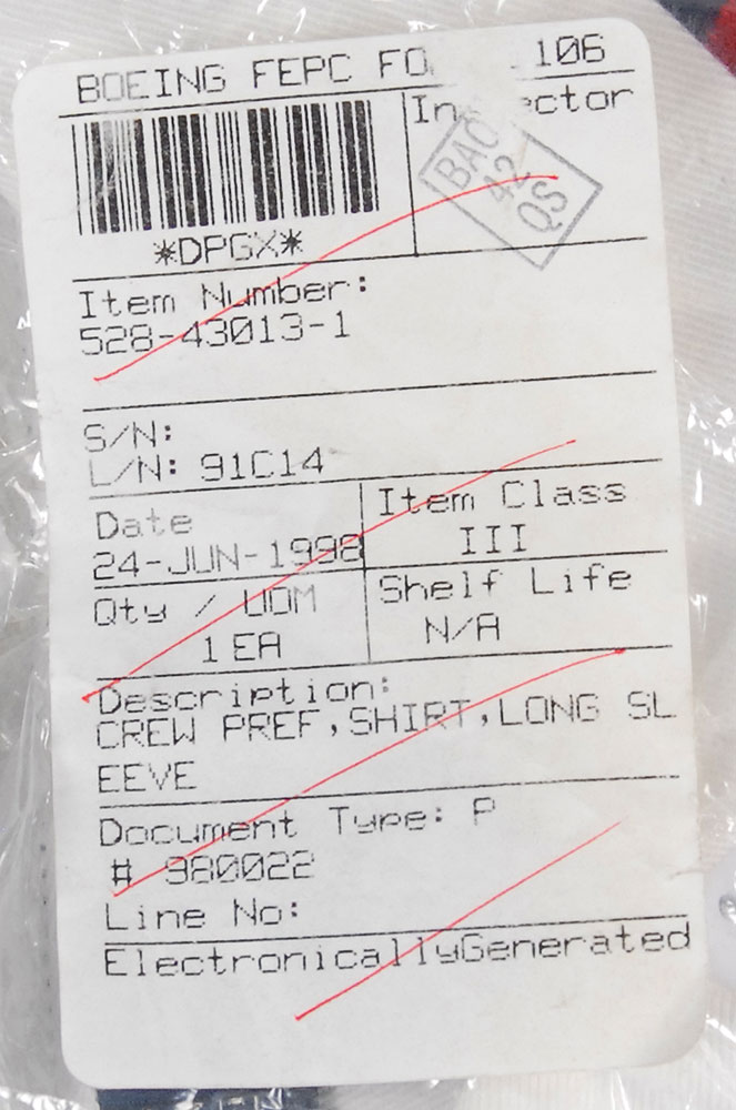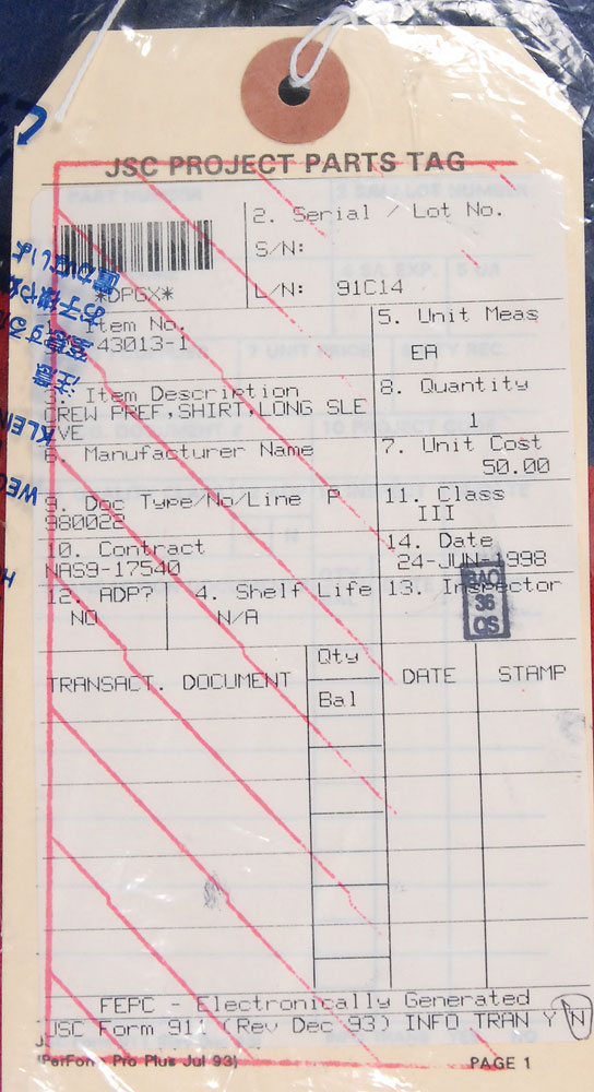Unused crew shirt from the shuttle Discovery mission STS-91. Longsleeve red, white, and blue shirt, size medium, bears a Lands’ End manufacturer’s label inside the collar, an embroidered mission patch over the left breast, and is still sealed in its plastic bag. Bag has two identification labels affixed to the front with a JSC Project parts tag for the shirt inside the bag. In fine condition. RR Auction COA.