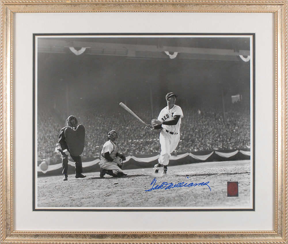 Fantastic glossy 19.25 x 15.25 photo of Williams leaving the batter’s box after a hit, signed in blue felt tip. Double-matted and framed to an overall size of 25.75 x 22. In fine condition. Accompanied by a certificate of authenticity from Green Diamond. Oversized. Pre-certified Steve Grad/PSA/DNA and RR Auction COA.